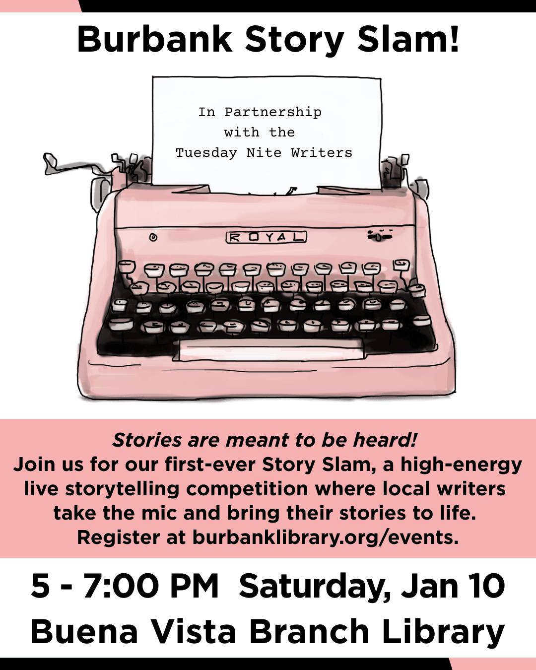 Buena Vista Library 300 N. Buena Vista St., Burbank, CA, United States10 writers. 5 minutes each. 3 judges. 1 unforgettable night. Stories are meant to be heard! Join us for our first-ever Story Slam, a high-energy live storytelling competition where local … read more »