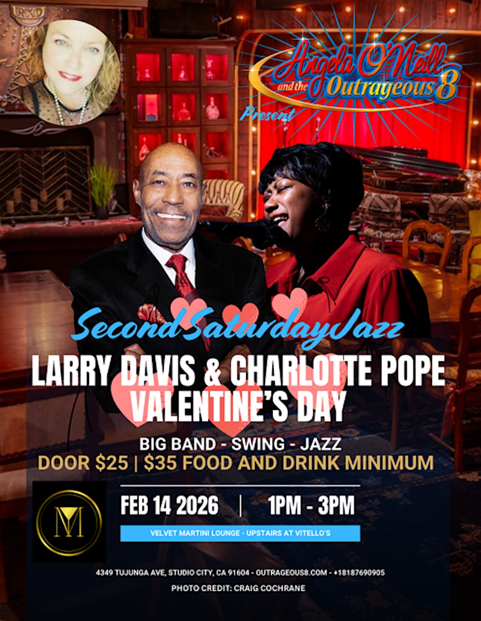 Velvet Martini Lounge 4349 Tujunga Avenue, Los Angeles, United States"Get ready to swing into your Saturday with an afternoon of big band jazz, outrageous energy, and iconic tunes, with a Valentine Twist! Get ready to swing into your Saturday with an unforgettable afternoon of big band jazz, outrageous energy, and iconic tunes—presented by Angela O’Neill & the Outrageous8, now celebrating 10 years of swingin’! … read more »