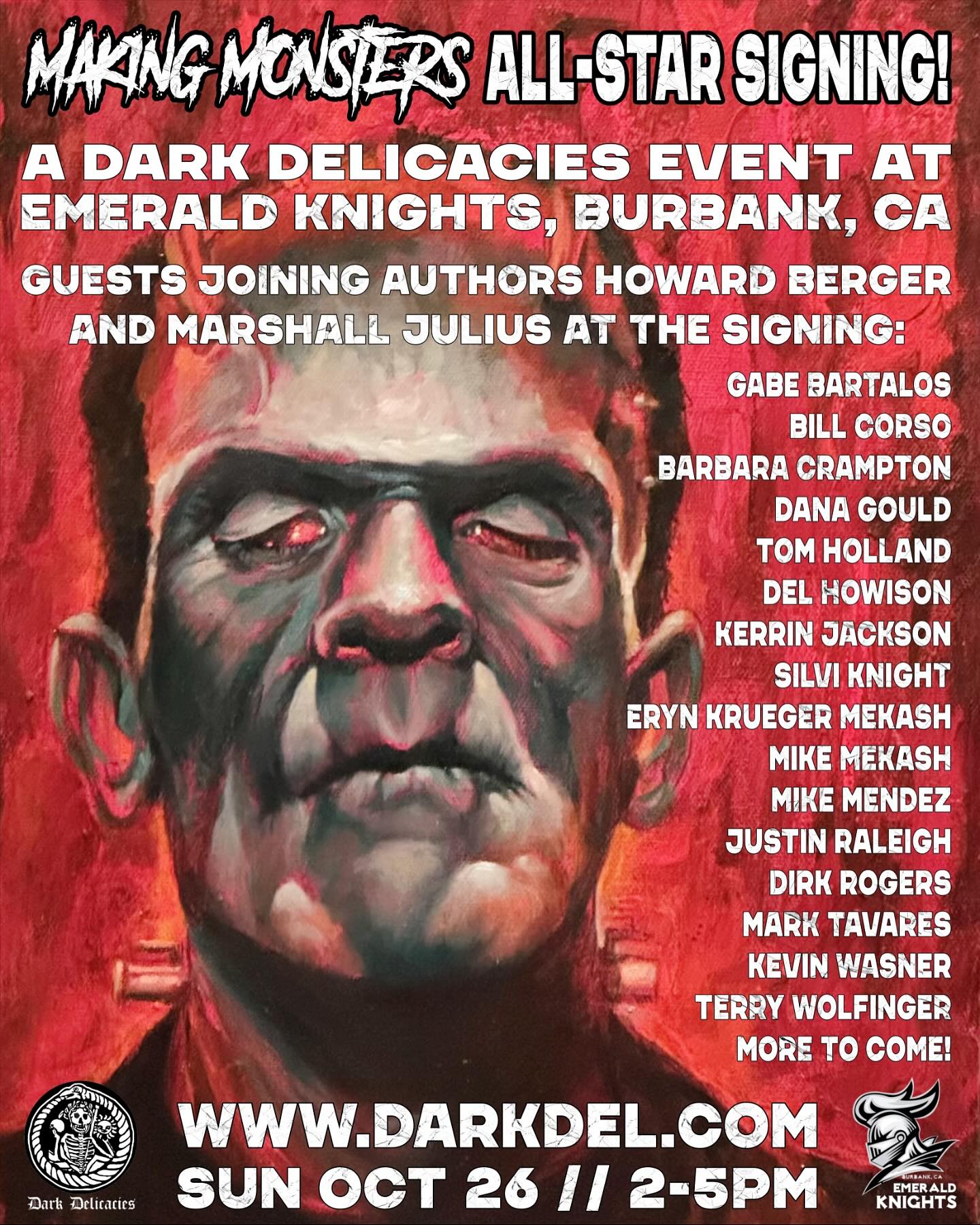 Emerald Knights 4116 Burbank Blvd, Burbank, CA, United StatesMAKING MONSIERS ALL STAR SICNINGL A DARK DELICACIES EVENT AT EMERALD KNIGHTS, BURBANK, CA GUESTS JOINING AUTHORS HOWARD BERGER AND MARSHALL JULIUS AT THE SIGNING: GABE BARTALOS BILL CORSO BARBARA CRAMPTON DANA GOULD TOM HOLLAND DEL HOWISON KERRIN JACKSON. SILVI KNIGHT ERYN KRUEGER MEKASH MIKE MEKASH MIKE MENDEZ JUSTIN RALEIGH DIRK ROGERS MARK TAVARES KEVIN … read more »