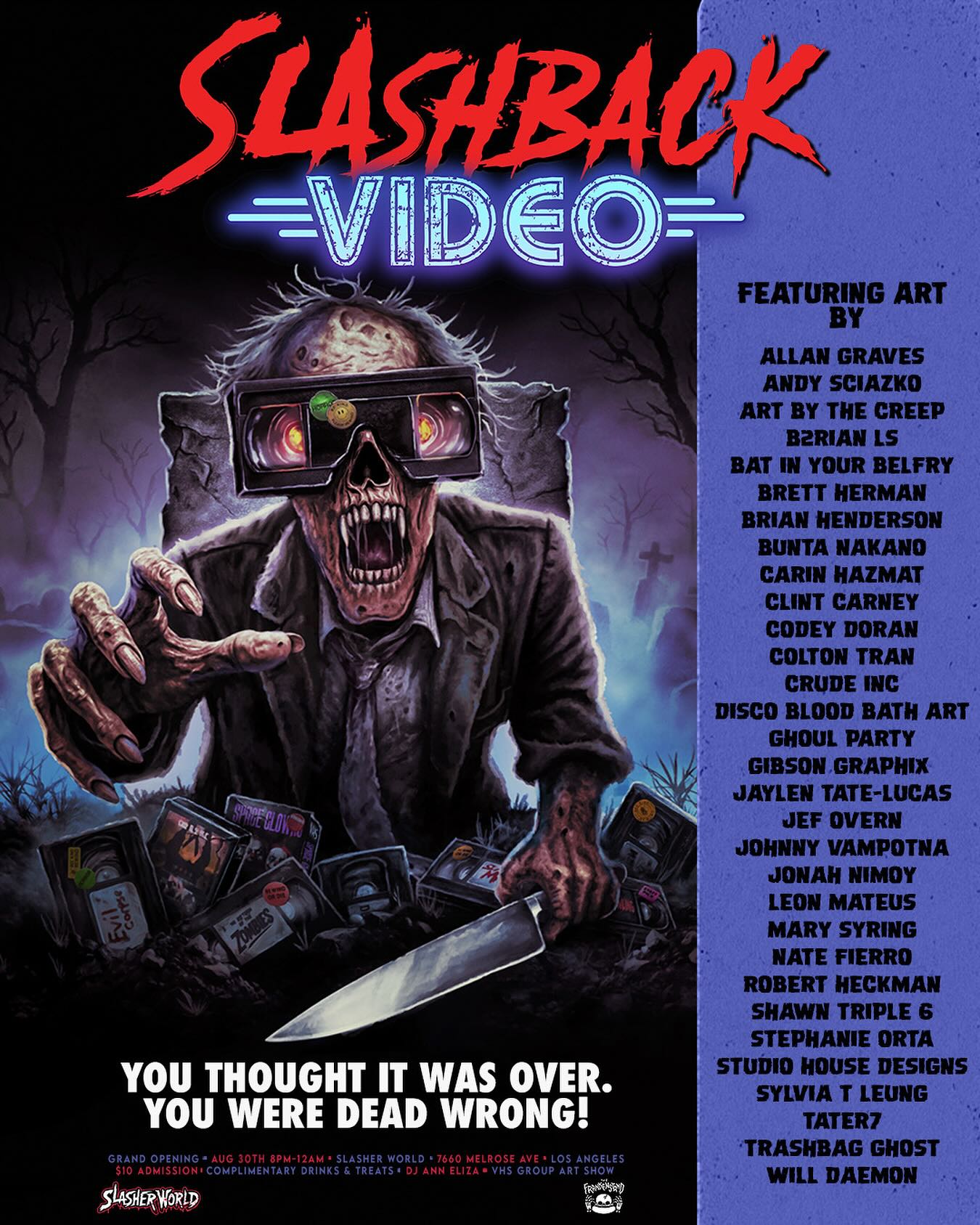 The grand opening of @slasherworldla & @slashbackvideo is Aug 30th, 8 PM–12 AM!