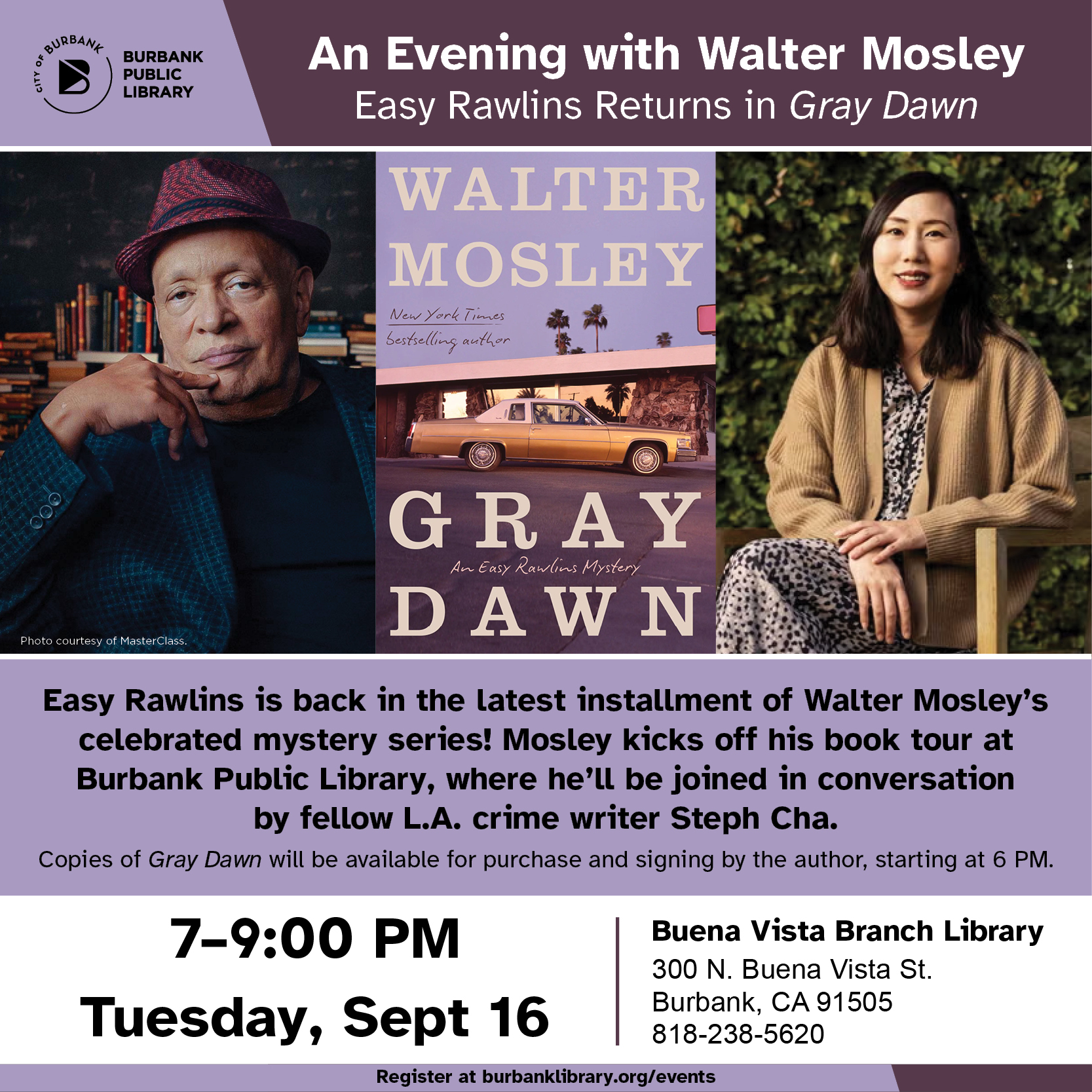 Buena Vista Library 300 N. Buena Vista St., Burbank, CA, United StatesEasy Rawlins is back! Walter Mosley is launching his book tour in Burbank with a conversation alongside fellow L.A. crime fiction writer Steph Cha. RSVP - https://burbank.libnet.info/event/14147737 Meet the author for an evening celebrating his distinguished career and the release of Gray Dawn, the latest installment in the Easy Rawlins series. Copies will be available … read more »
