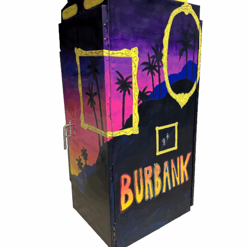 Box Description: I will depict Burbank's iconic mountain scape. On top of those mountains, I'll paint frames around the beauty of the sunset with a small artist painting her city.
